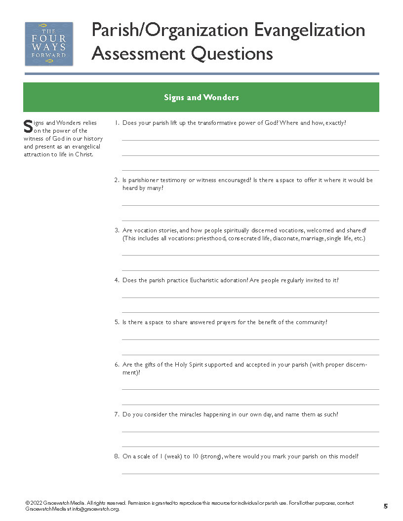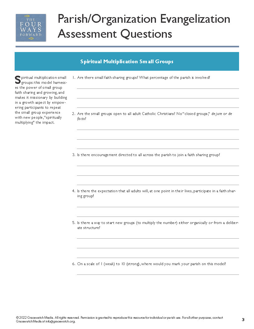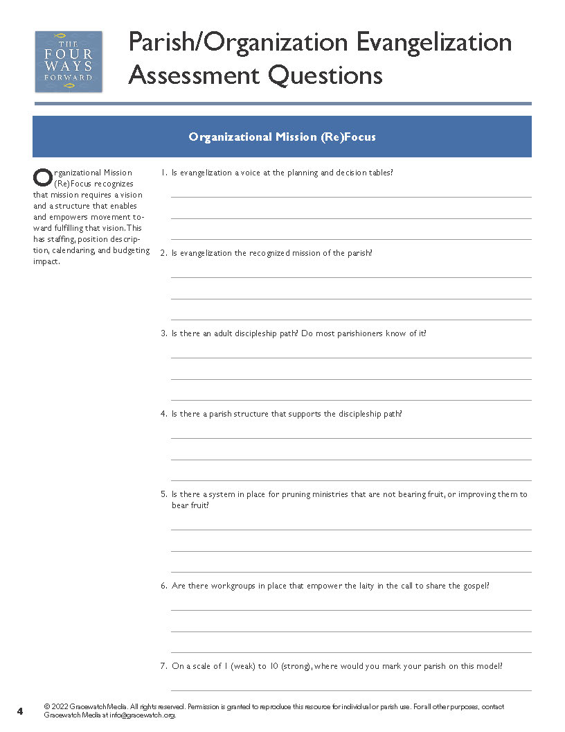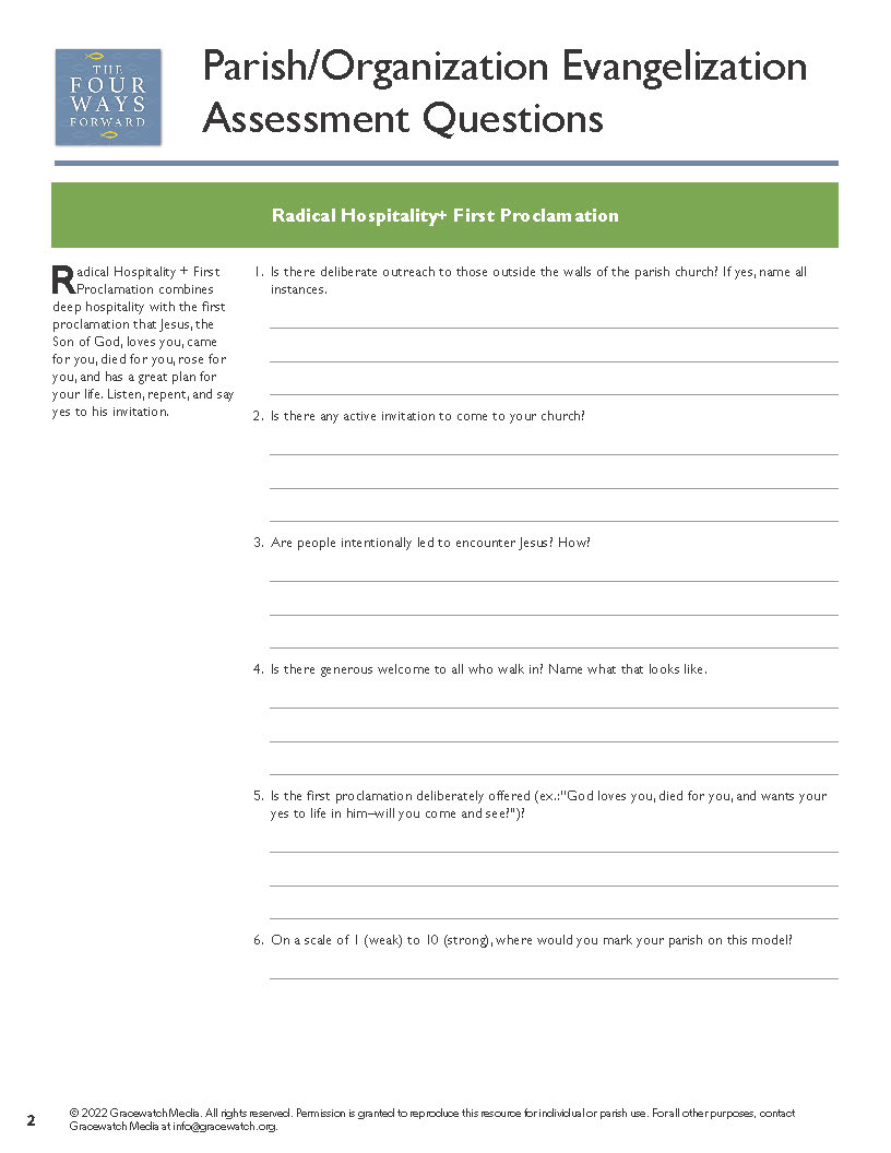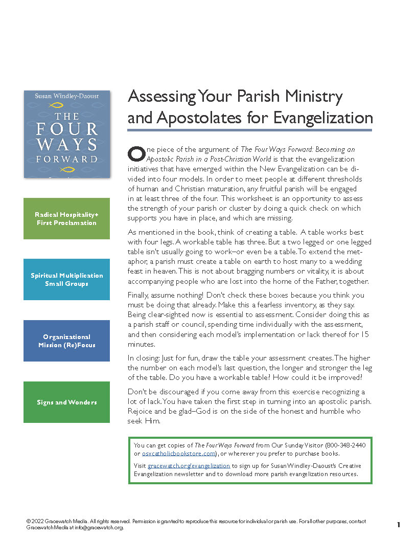 Any parish that wants to meet people at different thresholds of human and Christian maturation needs to be engaged in at least three of the four approaches that have emerged within the New Evangelization. This worksheet is an opportunity for parish leaders to assess the strength of your parish or cluster by doing a quick check on which supports you have in place, and which are missing.
