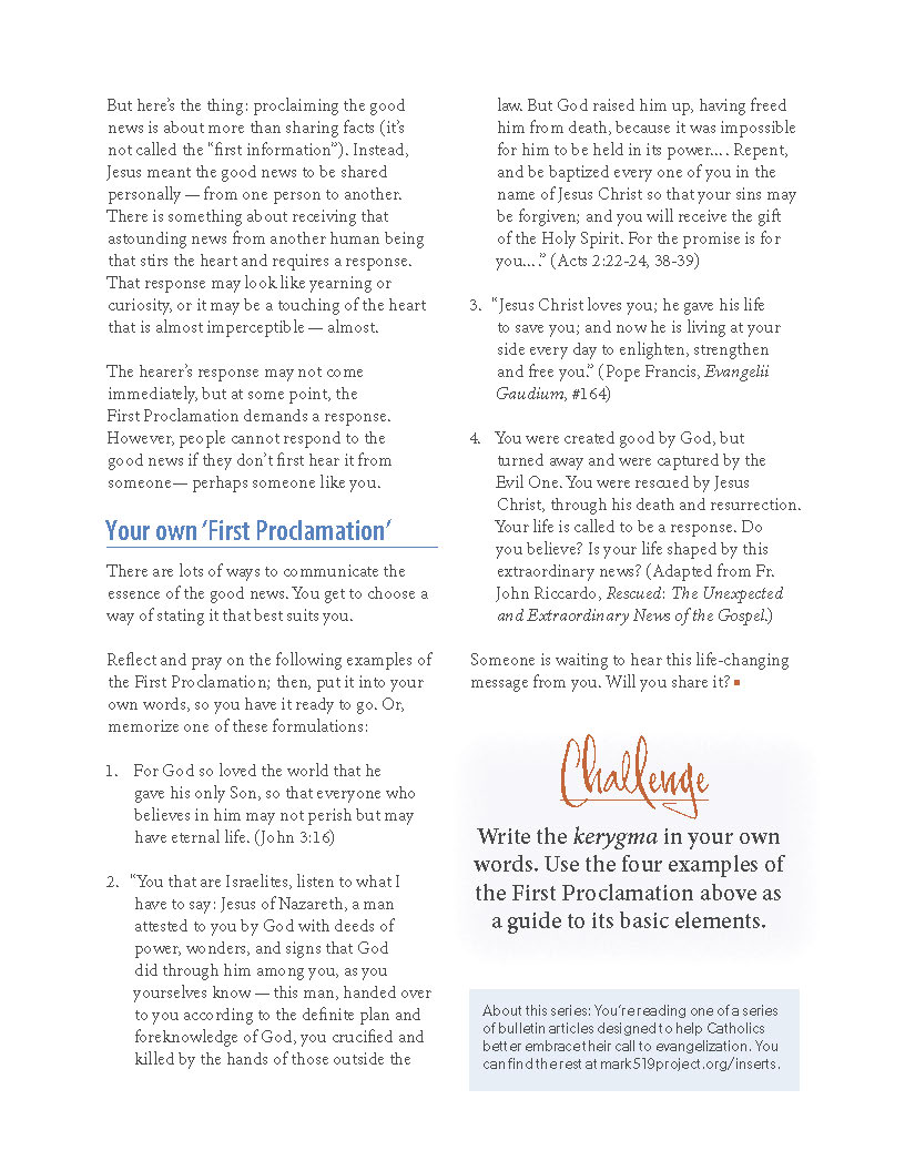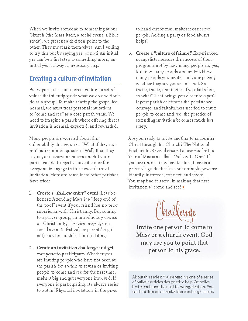 License terms: Each license is for 500 print copies or electronic distribution to 500 email addresses. For more than 500 copies, purchase one or more additional licenses. Do not post PDFs on your parish website. Tight budget? Contact susan@mark519project.org to inquire about reduced pricing.