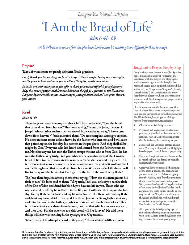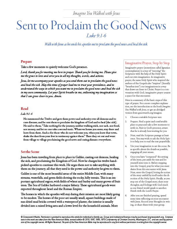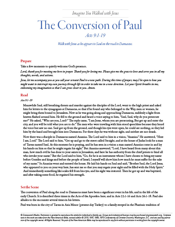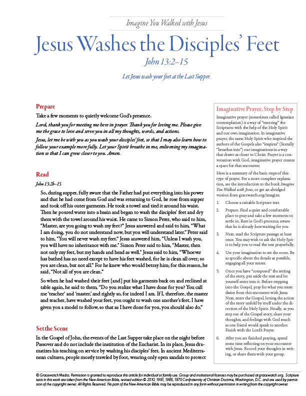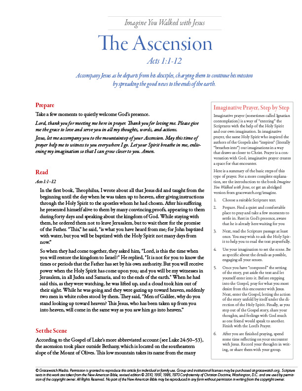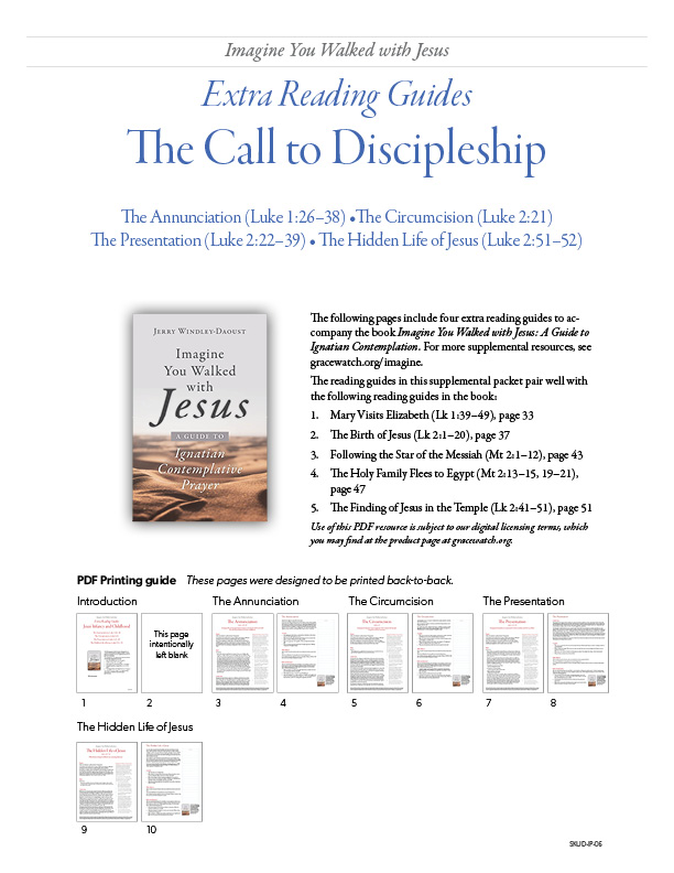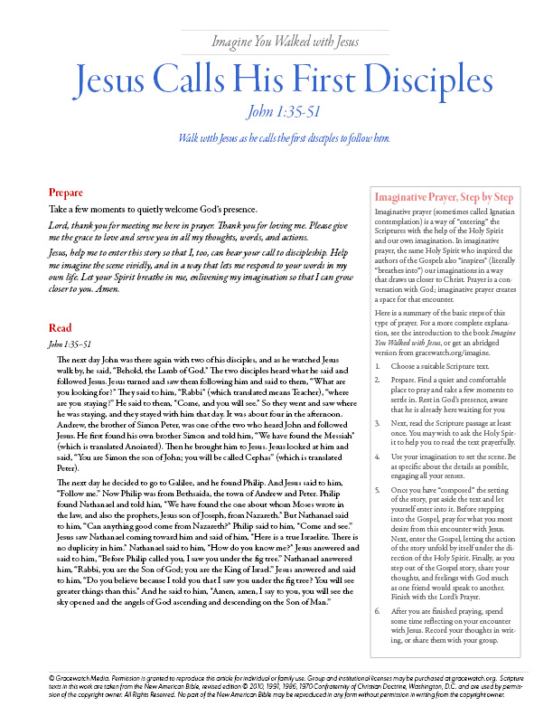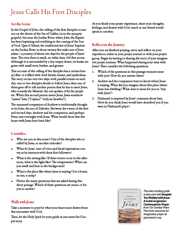 Imagine Jesus called you to be his disciple. This 12-page printable PDF includes six imaginative prayer reading guides: Jesus Calls His First Disciples (John 1:35-51); Sent to Proclaim the Good News (Luke 9:1-6); ‘I Am the Bread of Life’ (John 6:41-69); Jesus Washes the Disciples’ Feet (John 13:2-15); The Ascension (Acts 1:1-12); The Conversion of Paul (Acts 9:1-19). Each 2-page reading guide walks you through the steps of imaginative prayer (also called Ignatian contemplation), providing cultural and historical background to help you better imagine the text during your time of prayer. A handy PDF printing guide helps you easily print only the pages you want to print.
