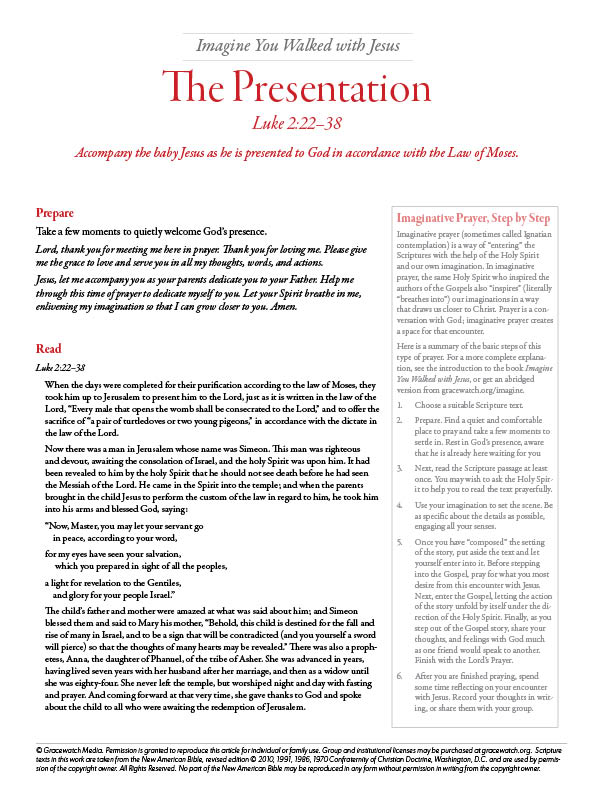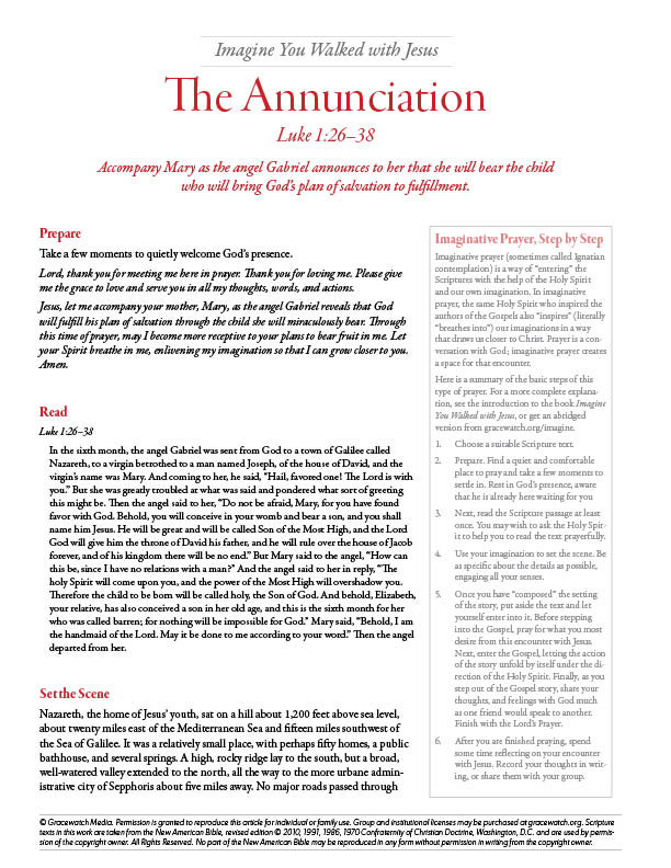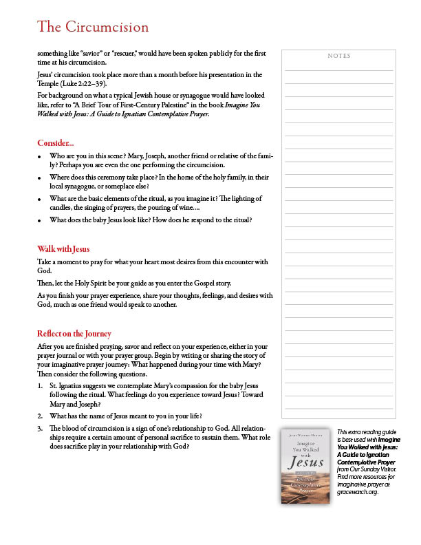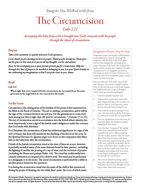 Imagine you were with Jesus during his infancy and childhood. This 8-page printable PDF includes four imaginative prayer reading guides: The Annunciation; The Circumcision; The Presentation; and The Hidden Life of Jesus. Each 2-page reading guide walks you through the steps of imaginative prayer (also called Ignatian contemplation), providing cultural and historical background to help you better imagine the text during your time of prayer. A handy PDF printing guide helps you easily print only the pages you want to print.